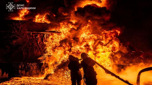 ▲ 우크라이나 하르키우 지역에 대한 러시아의 공격 이후 화재를 진압하기 위해 요원들이 작업하고 있다.