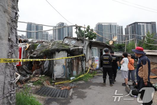 (서울=뉴스1) 이동해 기자 = 6일 오후 서울 강남구 구룡마을에서 화재가 발생한 가운데 경찰 과학수사 요원들이 현장 감식을 위해 출입을 통제하고 있다. 소방당국에 따르면 이날 오후 3시23분께 서울 강남구 구룡마을에 있는 공실에서 발생한 화재가 오후 4시52분께 완진됐으며 인명피해는 발생하지 않았다. 2025.7.6/뉴스1