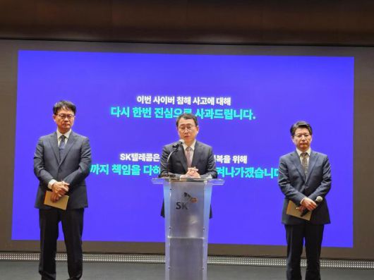정부의 해킹 사태 관련 최종 조사 결과가 발표된 4일 서울 중구 SKT타워에서 열린 해킹 사태 관련 입장 및 향후 계획 발표 기자회견에서 발언하고 있다. 사진은 (왼쪽부터) 류정환 네트워크 인프라 센터장, 유영상 CEO, 임봉호 MNO사업부장[사진=선재관 기자] |