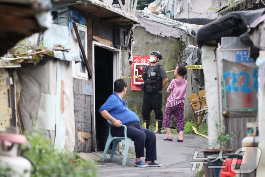 (서울=뉴스1) 이동해 기자 = 6일 오후 서울 강남구 구룡마을에서 화재가 발생한 가운데 경찰 과학수사 요원들이 현장 감식을 위해 출입을 통제하고 있다. 소방당국에 따르면 이날 오후 3시23분께 서울 강남구 구룡마을에 있는 공실에서 발생한 화재가 오후 4시52분께 완진됐으며 인명피해는 발생하지 않았다. 2025.7.6/뉴스1