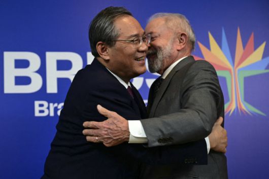 루이스 이니시우 룰라 다시우바 브라질 대통령(오른쪽)이 5일(현지시간) 브릭스 정상회의 참석을 위해 방문한 리창 중국 국무원 총리와 인사를 나누고 있다.AFP) |