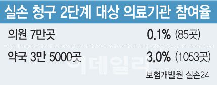 보험개발원에 따르면 전국 의원은 약 7만곳, 약국은 3만 5000곳으로 추산한다. 하지만 지난달 15일 기준 실손24 참여율은 의원 0.1%(85곳), 약국 3%(1053곳)에 불과한 실정이다. 앞서 시행한 1단계 역시 시행 8개월이 지났지만 참여율은 59%(4602곳)에 그치고 있다. 보험개발원은 EMR(전자의무기록) 업체를 통한 간접 설득 전략도 펼치고 있다. 실손24와 의료기관을 연동하기 위해 EMR 업체가 필요한 개발을 하도록 개발·확산비를 지원하며 관련 공고를 매달 내고 있다. 해당 비용은 보험사가 부담하며 시스템 구축을 간접적으로 유도하는 구조다.