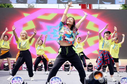 [서울=뉴스핌] 양윤모 기자 = 6일 평창군 진부면 시가지에서 열린 '제2회 오대산천 줌바경연대회' 주무대에서 줌바댄스 공연이 펼쳐지고 있다. 올해 행사에는 국내외 40여 개 팀이 참가해 축하 공연, 경연, DJ 파티타임, 마스터클래스 줌바시연 등을 펼친다. [사진=평창군청] 2025.07.06 yym58@newspim.com