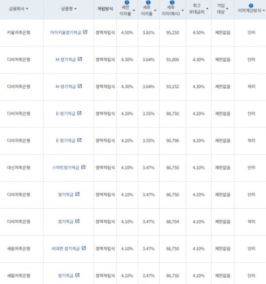 대신저축은행 스마트정기적금과 디비저축은행 정기적금은 연 4.10%의 금리를 제공한다. 세전 이자는 단리 기준 8만6000원이다.