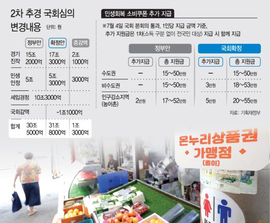6일 기획재정부에 따르면 지난 4일 국회를 통과한 추경안의 핵심은 민생회복 소비쿠폰 지원액과 국비 보조율의 지역별 차등 인상이다. 구체적으로 비수도권 주민은 15만∼50만원에서 18만∼53만원, 인구감소지역(농어촌) 주민은 17∼52만원에서 20∼55만원으로 지원금액이 늘어나게 된다. 국비 보조율도 서울이 70%에서 75%로, 나머지 지방자치단체는 80%에서 90%로 높였다. 이에 따라 소비쿠폰 예산은 당초 정부안 10조3000억원에서 12조2000억원으로 1조9000억원 증가했다.