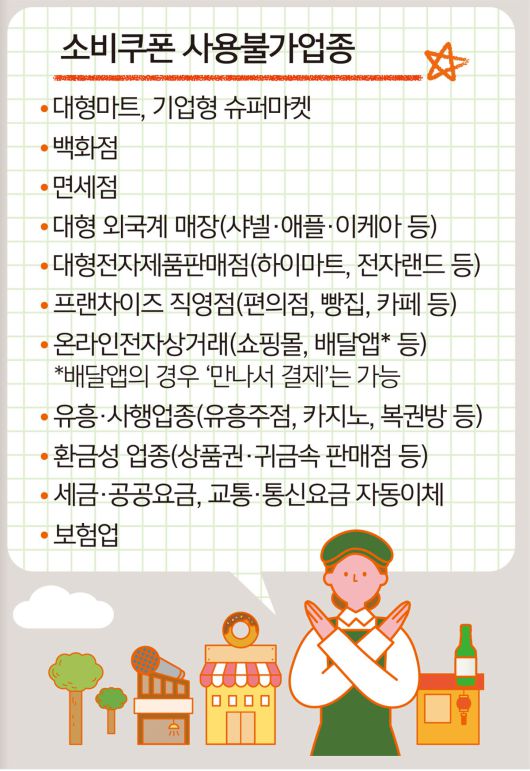 “연 매출액이 30억원 이하인 소상공인 사업장에서 민생 회복 소비쿠폰을 사용할 수 있다. 대형마트, 기업형 슈퍼마켓, 백화점 및 면세점, 대형 외국계 매장(애플·이케아 등), 온라인 쇼핑몰·배달앱 등에서는 사용이 제한된다. 유흥주점과 경마장 등 유흥·사행업종, 환금성 업종에도 사용할 수 없다. 사용 지역은 주소지 관할 지방자치단체로 제한한다. 특별시 또는 광역시 주민은 해당 특별시·광역시에서, 도 지역 주민은 주소에 해당하는 시·군에서 사용할 수 있다.”