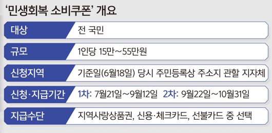정부가 이달 21일부터 최대 55만원의 ‘민생회복 소비쿠폰’을 전 국민에게 지급하기 시작한다. 1차로 15만~45만원을 지급하며 9월22일부터는 건강보험료 등을 기준으로 소득 상위 10%를 제외한 국민 90%에게 2차로 10만원을 추가 지급한다. 쿠폰은 전통시장, 동네 마트, 식당, 미용실, 안경점, 학원, 가맹 편의점 등에서 사용할 수 있다. 올 11월30일까지 사용해야 하며, 기간 내 사용하지 못한 잔액은 소멸될 예정이다. 정부가 5일 발표한 브리핑 및 안내문을 토대로 민생회복 소비쿠폰 신청 방법 및 사용처, 기부 방법 등을 질의응답(Q&A) 방식으로 알아봤다.
