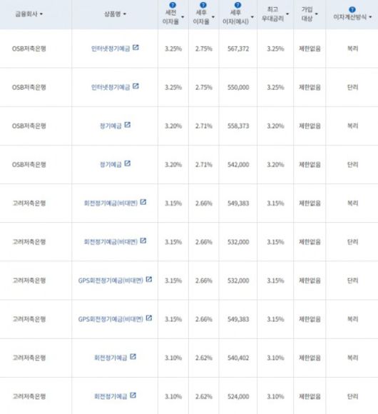 이어 고려저축은행의 '회전정기예금(비대면)', 'GPS 회전정기예금(비대면)'이 연 3.15%의 금리를 제공하며 뒤를 이었다.