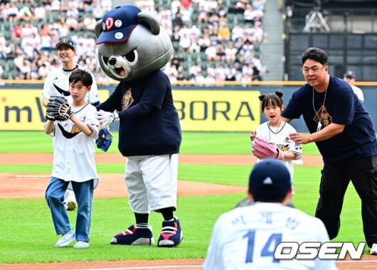 김재호가 아들, 딸이 시구를 하고 있다. 2025.07.05 /jpnews@osen.co.kr