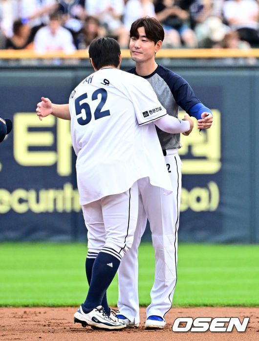 [OSEN=잠실, 지형준 기자] 6일 오후 서울 잠실구장에서 ‘2025 신한 SOL Bank KBO리그’ 두산 베어스와 KT 위즈의 경기가 열렸다.두산은 최승용, KT는 엔마누엘 데 헤이수스를 선발로 내세웠다.두산은 이날 2024시즌을 끝으로 은퇴를 선언한 김재호의 은퇴식을 개최한다. 은퇴식 테마는 ‘베어스 올타임 No.1 유격수 김재호’이다. 김재호는 은퇴선수 특별 엔트리를 통해 1군 엔트리에도 이름을 올렸다.1회 김재호가 교체되며 두산 양의지와 포옹을 하고 있다. 2025.07.05 / |