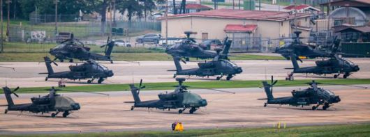 5월 23일 경기 평택시 캠프 험프리스에 주한미군 아파치 헬기가 세워져 있다. 뉴시스 |
