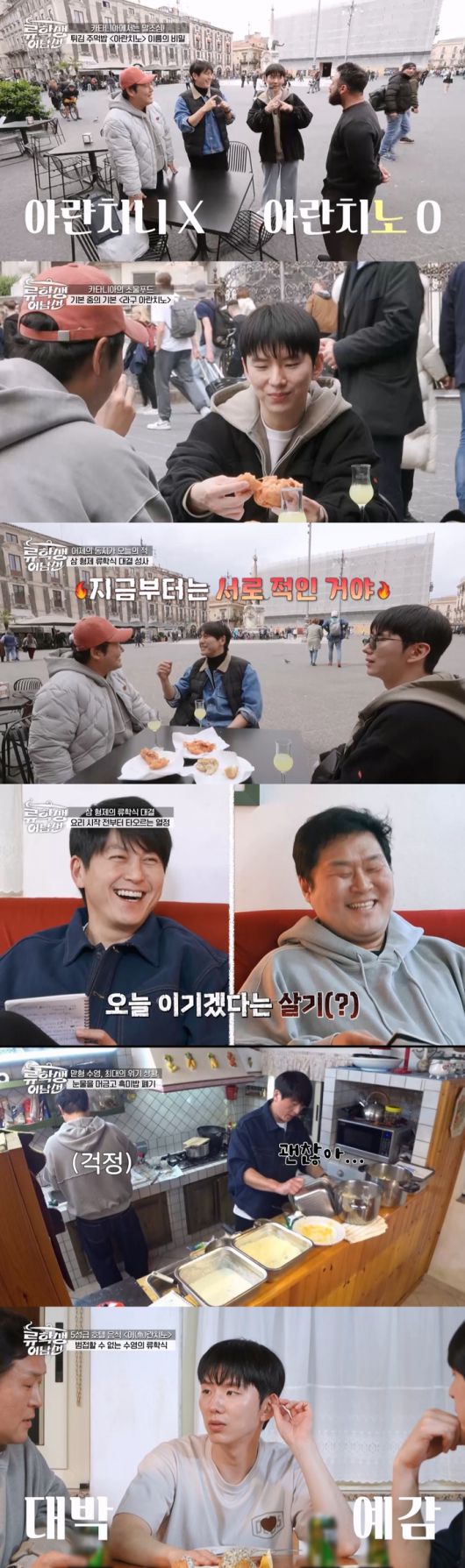 숙소에 돌아가자 윤경호는 “각오는 되셨겠죠?”라며 류수영을 도발했고, 류수영은 “경호의 눈빛에서 살기가 보인다”고 받아쳤다. 마침내 시작된 경쟁은 각자의 특색을 살린 가운데, 마구 불붙기 시작했다. 특히 요리 실력이 장족의 발전 중인 ‘K-아빠’ 윤경호는 김치볶음밥 베이스로 ‘아란치노’의 비주얼을 심상찮게 업그레이드해 군침을 자아냈다. 한껏 자기애가 올라간 윤경호는 “제가 이야기했죠 형? 긴장하시라고...”라며 거드름을 피웠다.