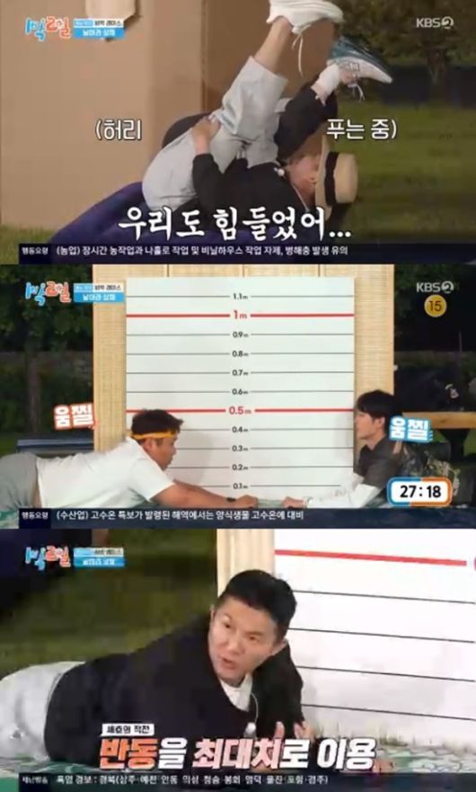 조세호는 평상에 신문지만 덮고 자게 된 상황에 분노한 나머지 탈의실로 해놓은 박스를 뒤돌려차기로 무너뜨렸다.