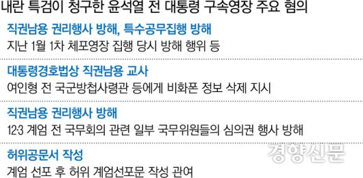 특수공무집행방해 혐의는 지난달 24일 윤 전 대통령 체포영장을 법원에 청구할 당시 영장청구서에 적시됐던 혐의다. 경찰은 사건을 특검에 넘기기 전부터 윤 전 대통령이 지난 1월 고위공직자범죄수사처 등의 체포영장 집행을 위법하게 저지했다며 수사해왔다. 특검팀은 이 과정에서도 윤 전 대통령이 대통령경호처 직원을 대상으로 직권남용죄를 범했다고 보고 있다. 이 밖에도 계엄 동원 군사령관의 비화폰 서버 삭제 지시와 관련해 대통령경호법상 직권남용 혐의가 적용됐다.