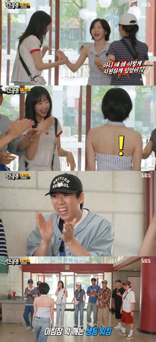 게스트 주현영이 등이 파인 옷을 입고 등장하자 송지효는 "얘 왜 이렇게 시원하게 입었어?"라며 놀라움을 감추지 못했다. 지예은도 "왜 수영복을 입고 왔냐"라며 말했다.