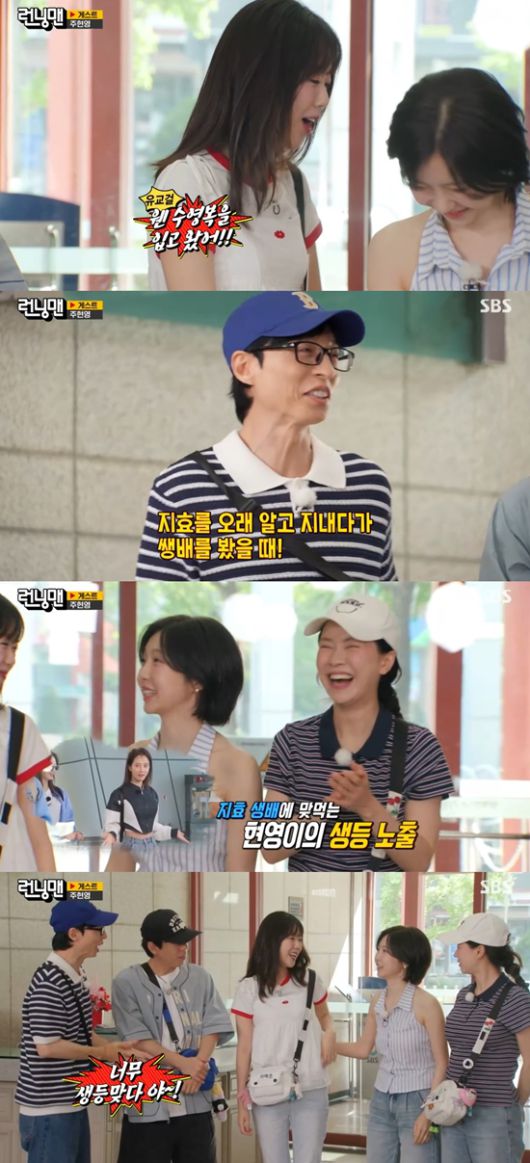 유재석은 "내가 예전에 지효를 오래 알고 지내다가 생배를 봤을 때 (느낌이다). 현영이의 생득은 너무 생등 맞다"라며 언어유희를 섞은 농담을 건넸다.