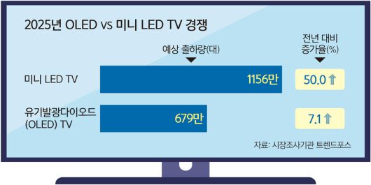 미니LED는 OLED보다 기술 수준이 한 단계 낮은 것으로 평가되지만, 최근 밝기·명암비·표현력 등을 크게 향상시키며 프리미엄 시장에서도 존재감을 키우고 있다. 특히 TCL, 하이센스, 샤오미 등 중국 업체들이 경쟁적으로 새 미니LED TV를 출시 중이다. 최근 시장조사기관 트렌드포스는 올해 미니LED TV의 전년 대비 출하량 증가율이 OLED TV(7.1%)의 7배가 넘는 50%에 달할 것으로 내다봤다.