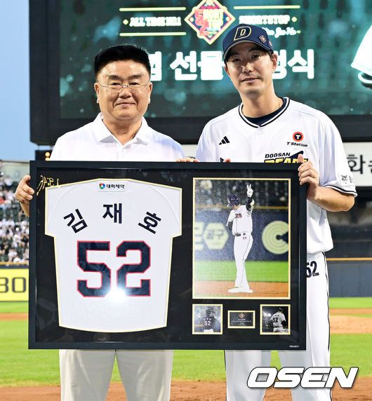 클리닝타임 김재호가 선물 전달식을 갖고 두산 김태룡 단장과 사진 촬영을 하고 있다. 2025.07.05 /jpnews@osen.co.kr