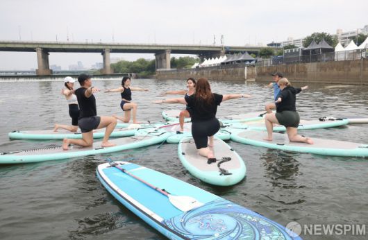 [서울=뉴스핌] 서울 잠실 한강공원 수상지역에서 6일 열린 2025 0APP월드투어 서울 SUP 오픈(이하 서울 SUP 오픈) 대회에서 시민들이 플로팅 요가 체험을 하고 있다. 이 행사는 KAPP(대한 패들서프 프로협회), 서울시서핑협회(SSA),서울특별시체육회가 주관하고 서울특별시에서 후원하며 7월 5일, 6일 양일간 서울 잠실 한강공원 수상지역에서 펼쳐졌다. [사진=KAPP] 2025.07.06 photo@newspim.com