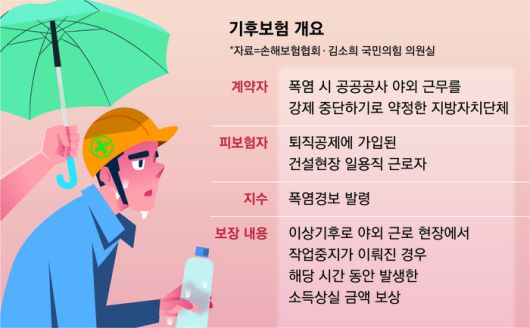 보험은 오후 근무시간(1시) 이전 이상기후 조건이 발생돼 기후보험 운영지침에 따라 야외 근로 현장에서 작업중지가 이뤄진 경우 그 시간 동안 발생한 소득 상실 금액을 보상해준다. 여기서 이상기후란 폭염경보가 발령된 경우를 뜻한다. 계약 대상은 폭염이 발생하면 공공공사 야외 근무를 강제 중단하기로 약정한 지방자치단체다. 피보험자는 공공공사 근로자로서 퇴직공제에 가입된 일용직 근로자 등이다.