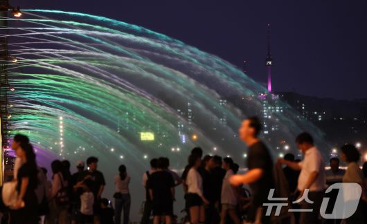 (서울=뉴스1) 이동해 기자 = 일주일째 열대야가 이어진 6일 오후 서울 반포대교 아래에서 시민들이 무지개 분수를 보며 더위를 식히고 있다. 2025.7.6/뉴스1eastsea@news1.krCopyright ⓒ 뉴스1. All rights reserved. 무단 전재 및 재배포, AI학습 이용 금지.