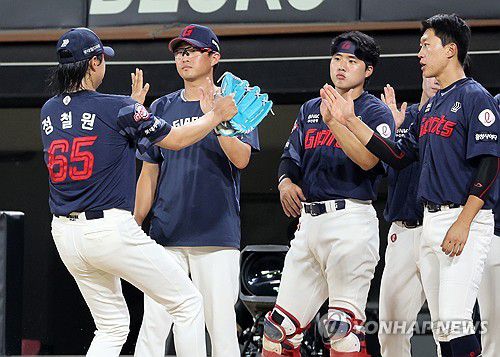 (광주=연합뉴스) 조남수 기자 = 6일 광주기아챔피언스필드에서 열린 프로야구 롯데 자이언츠와 KIA 타이거즈의 경기. 롯데 정철원이 8회에 교체되며 더그아웃 앞에서 동료의 환영을 받고 있다. 2025.7.6