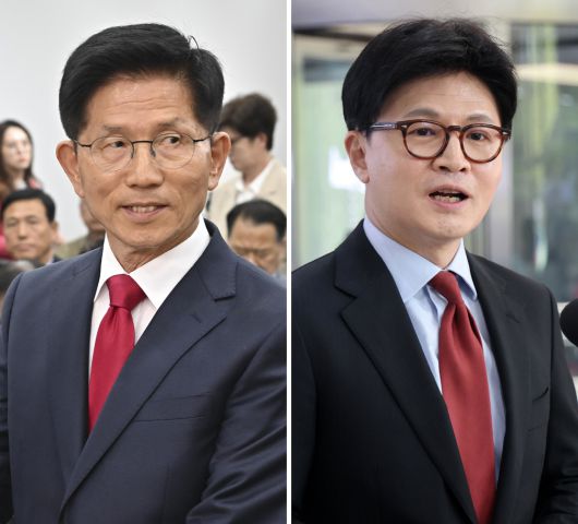 국민의힘이 오는 8월 전당대회를 열기로 하면서 누가 당대표로 나설지 주목된다. 지난 대선 경선 결선에서 맞붙었던 김문수 전 고용노동부 장관(왼쪽 사진)과 한동훈 전 국민의힘 대표(오른쪽)가 재대결을 벌일지가 관심을 끈다. 김 전 장관은 최근 잇따른 공개 행보로 출마설이 나온다. 한 전 대표는 온라인 활동을 활발히 하지만, 측근들 사이에선 출마에 부정적인 기류가 우세하다. 한 전 대표와 가까운 6선의 조경태 국민의힘 의원은 6일 당대표 출마 의사를 밝혔다.