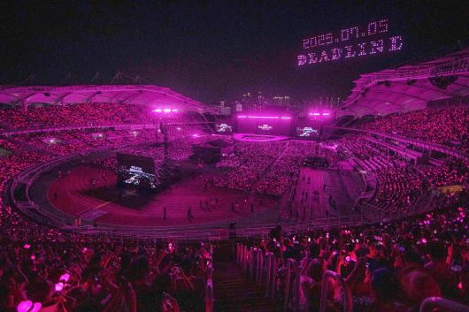 6일 오후 경기 고양종합운동장 주경기장. 2022년 타임이 ‘세계에서 가장 영향력 있는 걸그룹’이라고 불렀던 블랙핑크의 귀환에는 긴 말이 필요 없었다. 리프트를 타고 강렬한 폭죽과 함께 무대에 등장한 블랙핑크는 우레와 같은 함성 속에 노래를 부르며 팬들이 그토록 기다려왔던 멤버 4명의 ‘완전체’ 퍼포먼스를 펼쳐 보였다. 객석에는 블링크(Blink·블랙핑크 팬덤명)들이 흔드는 뿅망치 모양의 응원봉, 일명 ‘뿅봉’의 핑크빛 파도가 번졌다. 공연 막바지 신곡 ‘뛰어’를 부를 때는 가사 속 ‘블랙핑크가 왔다(Blackpink in your area)’ 한 마디에 장내 열기가 한껏 달궈져 풍선처럼 부풀어 올랐다.