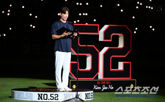6일 잠실야구장에서 열린 KT와 두산의 경기, 경기 후 진행된 김재호의 은퇴식에서 김재호가 은퇴사를 하고 있다. 잠실=허상욱 기자wook@sportschosun.com/2025.07.06/