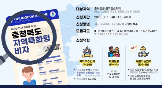 충북도는 인구감소지역의 외국인 정착을 돕는 지역특화형 비자 사업 중 ' 수인재(F-2-R)'유형의 소득요건이 대폭 완화됐다고 6일 밝혔다.
