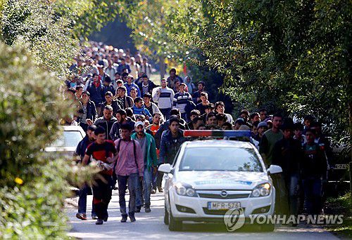 헝가리-오스트리아 국경 넘는 시리아 난민들(2015년) |