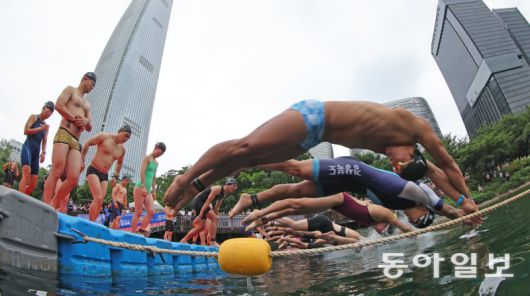 6일 오전 서울 송파구 잠실 석촌호수에서 열린 ‘2025 롯데 아쿠아슬론’에서 참가자들이 수영을 하고 있다. 올해로 4번째 열리는 롯데 아쿠아슬론은 석촌호수 동호를 두 바퀴(총 1.5km) 도는 오픈워터 수영 후 롯데월드타워 1층부터 123층까지 2917개의 계단을 오르는 수직마라톤 ‘스카이런’으로 진행됐다.