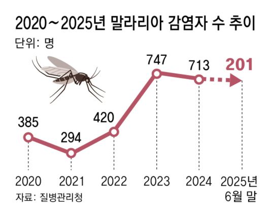 최근 수도권에서 붉은등우단털파리(러브버그)가 대량 발생한 가운데 말라리아를 매개하는 얼룩날개모기도 늘어나면서 피해가 커지는 것으로 나타났다. 질병관리청에 따르면 2021년 294명이었던 국내 말라리아 환자는 2022년 420명, 2023년 747명, 지난해 713명 등으로 늘어났다. 올해는 6월 말까지 총 201명이 말라리아에 감염됐다. 통상 7∼9월에 본격 유행하는 것을 감안하면 연내 환자가 더 늘어날 가능성이 크다.