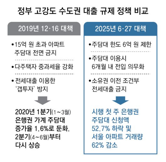 문재인 정부 당시 대출 규제가 대표적이다. 한국개발연구원(KDI)이 지난해 9월 공개한 ‘가계대출 규제의 규제영향 분석에 관한 연구’에 따르면 주담대 규제의 직접적인 효과는 약 6개월로 나타났다. 분석 대상은 2017년과 2019년, 2022년에 나왔던 주담대 규제다. 특히 2019년 대책에는 15억 원 초과 아파트의 주담대를 전면 차단하고 9억 원 초과 주택의 주택담보인정비율(LTV)을 절반으로 낮추는 등 초강력 규제가 담겼다. 당시 대출 규제를 연구한 유경원 상명대 경제금융학부 교수는 “정부의 대출 규제로 은행들의 대출 태도가 (긴축적으로) 바뀐다고 하더라도 시장의 강력한 수요가 존재할 경우 오히려 대출은 늘어날 수 있다”며 “2019년 규제에도 주담대가 늘어난 것은 주택 시장에 ‘오늘이 가장 싸다’, ‘벼락거지’ 프레임이 확산될 정도로 불안 심리에 편승한 수요가 압도적이었기 때문”이라고 설명했다.