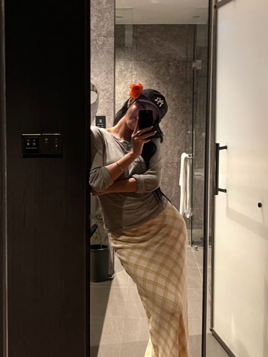 이어진 사진에서는 회색 긴팔셔츠에 롱스커트 차림으로 거울 셀카를 찍는 모습인데, 노출을 전혀 하지 않고 콜라병 몸매를 자랑하고 있어 눈길을 끈다.