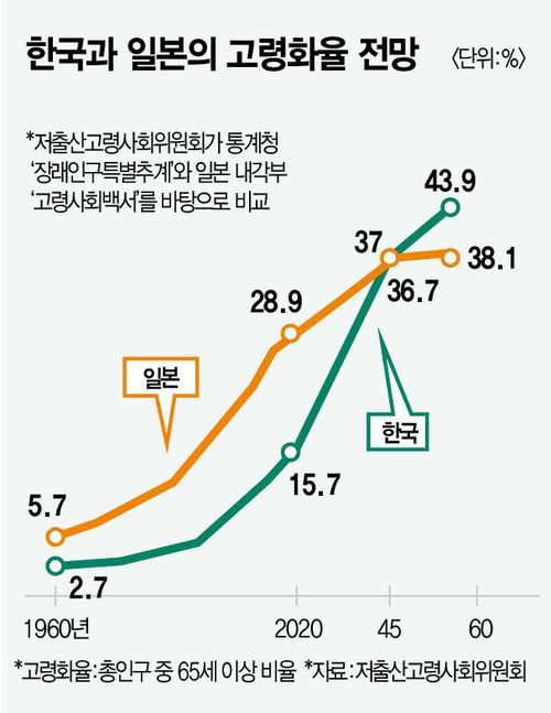 한국이 마주할 미래가 심각한 이유는 늙어가는 속도 때문이다. 고령사회 돌입 이후 초고령사회까지 걸린 기간은 불과 8년으로 전 세계에서 가장 빠르다. 2042년이면 고령인구 비율이 37%까지 높아져 ‘세계에서 가장 늙은 나라’가 된다. 늙은 나라는 생산 가능 연령 인구가 줄어 경제 활력이 떨어진다. 전 세계 합계출산율 꼴찌인 현실을 감안하면 미래는 더욱 암울해진다.