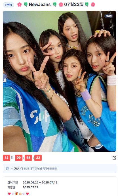7일 오후 2시 기준 2300 하트가 모였으며, 팬들은 "Happy NewJeans♡", "NJZ 데뷔일 넘넘 축하해!!!" 등 진심 어린 메시지를 남기고 있다. 이벤트 종료일까지 더 많은 팬들의 축하 댓글과 하트 참여가 이어질 것으로 기대된다.