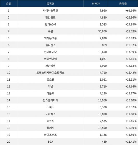 이어 상승률 2위 한컴위드(054920)는 주가가 29.96% 상한가를 기록하며 종가 4,880원에 상승 마감했다. 상승률 3위 현대ADM(187660)의 주가는 1,523원으로 29.95% 상한가를 기록했다. 상승률 4위 쿠콘(294570)은 28.32% 상승하며 35,800원에 마감했다. 상승률 5위 엑시온그룹(069920)은 19.93%의 급등세를 타고 종가 2,070원에 마감했다.