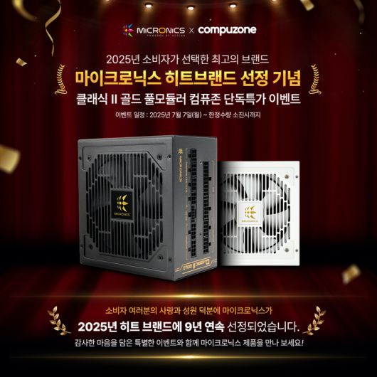 [디지털포스트(PC사랑)=임병선 기자] 게이밍 기기 디자인·개발·제조 전문기업 한미마이크로닉스(대표: 강현민, 이하 마이크로닉스)는 '2025 히트브랜드' 파워서플라이 부문 수상을 기념해, 자사의 대표 파워서플라이 제품인 '클래식 II 골드 풀모듈러' 시리즈의 할인 행사를 진행한다고 밝혔다.
