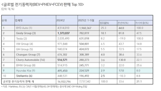 브랜드별로는 BYD가 196만367대를 팔아 1위(25.3%)에 올랐고, 2위는 지리그룹(78만2819대), 3위는 테슬라(63만1018대)로 집계됐다. 현대차·기아는 22만4529대를 팔아 9위를 차지했다.
