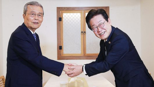 이재명 더불어민주당 대표와 김종인 전 국민의힘 비상대책위원장이 12일 서울 종로구 광화문의 한 식당에서 회동, 악수하고 있다. |