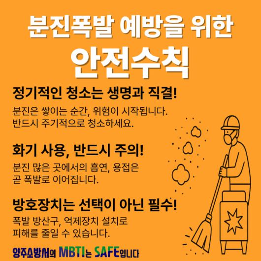 [양주=뉴스핌]신선호 기자=양주소방서는 분진이 쌓이기 쉬운 제조업 현장 및 공사장을 중심으로 분진폭발 사고를 예방하기 위한 안전수칙 홍보 콘텐츠를 제작·배포하고, 집중 홍보에 나섰다고 7일 밝혔다.
