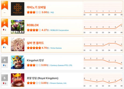 지난주 잠깐 1위를 차지하기도 했던 ‘킹샷’은 이번 주에는 4위로 소폭 하락했다. 반면, 한때 10위권 밖으로 밀려났던 ‘로얄킹덤’은 다시 5위에 진입하며 반등에 성공했다. 중위권에서는 ‘갓깨비 키우기’와 ‘WOS: 화이트 아웃 서바이벌’이 각각 6위와 7위를 유지하며 변동 없이 자리를 지켰고, ‘로얄매치’ 역시 8위에 머무르며 드림게임즈 대표작들의 안정적인 인기를 보여주고 있다.