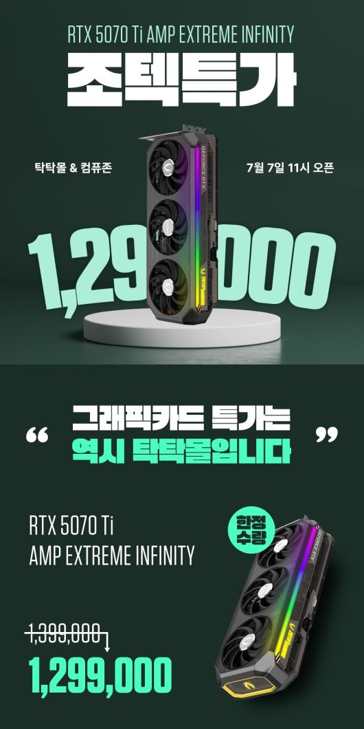 조텍의 특가 이벤트로 만날 수 있는 ‘ZOTAC GAMING GeForce RTX 5070 Ti AMP Extreme Infinity’는 조텍 공식 쇼핑몰 탁탁몰(www.tagtag.co.kr)과 컴퓨존에서 7월 7일 오전 11시부터 동시 특가가 진행된다. 판매가 1,399,000원에 판매되는 제품을 10만원 할인된 1,299,000원에 만나볼 수 있다.