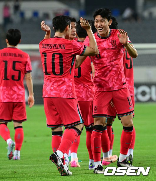 전반 한국 이동경이 선제골을 넣은 뒤 김봉수와 기뻐하고 있다. 2025.07.07 /cej@osen.co.kr