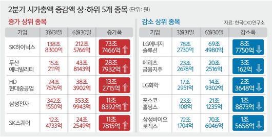 시총 증가액이 1조원 넘게 상승한 곳은 84곳이며, 이 중 시총이 가장 많이 증가한 곳은 SK하이닉스다. SK하이닉스의 시총은 3월 말 138조8300억원에서 6월 말 212조5766억원으로 3개월 새 73조7466억원 증가했다. 특히 국내 상장사 가운데 시총 200조원 벽을 넘은 건 삼성전자(2012년 4월 27일)에 이어 역대 두 번째다. 엔비디아의 인공지능(AI) 가속기에 들어가는 고대역폭메모리(HBM) 시장을 SK하이닉스가 장악한 덕분이다.