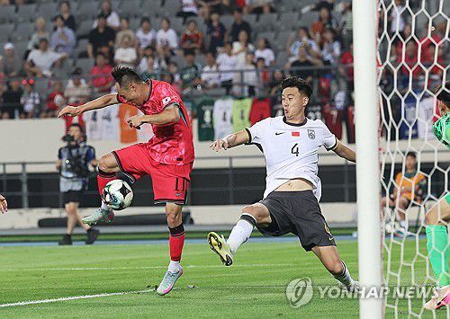 (용인=연합뉴스) 홍기원 기자 = 7일 경기도 용인미르스타디움에서 열린 2025년 동아시아축구연맹(EAFF) E-1 챔피언십(동아시안컵) 남자부 1차전 한국과 중국의 경기. 한국 문선민이 슛하고 있다. 2025.7.7