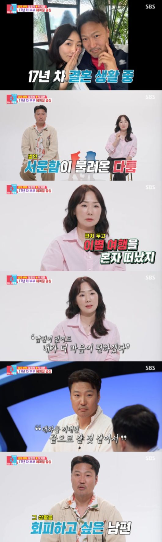 뿐만 아니라 박지윤은 "서운함이 오랜 시간 쌓여서 다투게 된다. 쌓인게 많으니까 별거 아닌 일에도 화가 난다"고 했고, 정형석은 "몇 년 전에 7장의 편지를 써놓고 아이들과 떠났다"면서 하나의 에피소드를 떠올렸다.