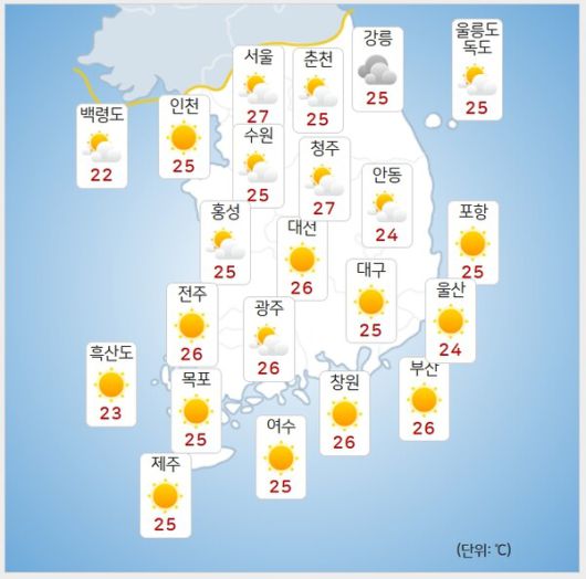전국 주요 도시별 예상 최저 기온은 △서울 27도 △인천 25도 △춘천 25도 △강릉 25도 △대전 26도 △대구 25도 △전주 26도 △광주 26도 △부산 26도 △제주 25도 △울릉도 독도 25도다.