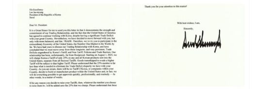상호관세 유예기한 만료가 임박한 상황에서 아직 무역합의를 이루지 못한 한국에 관세율을 서한으로 통보한 것이다. 다만 협상에 따라 관세율 조정을 고려할 수 있다며 여지를 열어뒀다.